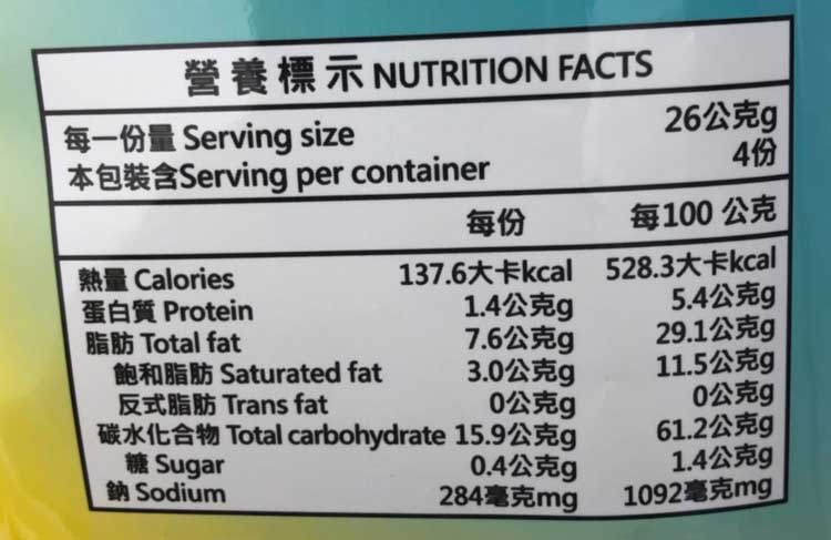 | 內容物(成分) | 玉米粉(非基因改造)、棕櫚油、樹薯澱粉、複合調味料[麥芽糊精、糖粉、調味劑(L-麩酸鈉、琥珀酸二鈉、5'-次黃嘌呤核苷磷酸二鈉、5-鳥嘌呤核苷磷酸二鈉、DL-胺基丙酸、胺基乙酸、鹽粉、玉米香料(麥芽糊精、乳糖、阿拉伯膠、椰子油、 芥花油、二氣化矽、三乙酸甘油酯、維生素E(抗氧化劑)】·玉米粉、碳酸氣鈉、葡葡糖酸-§-内酯、酸性焦磷酸鈉 |
