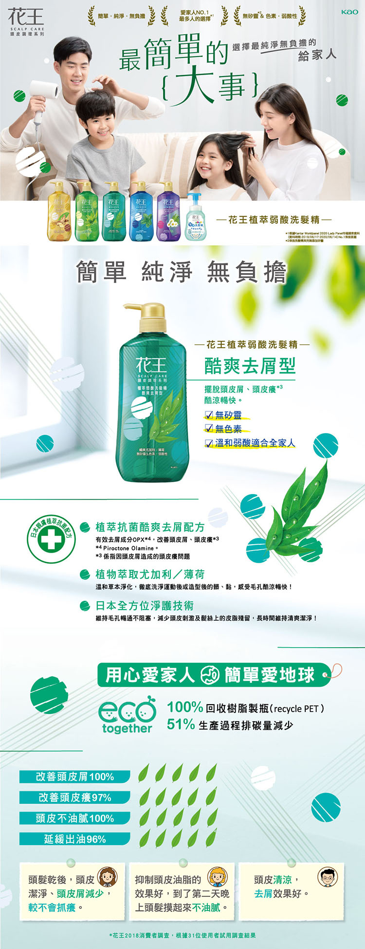 | 產品特色 | ‧無矽靈&色素、溫和弱酸適合全家人 ‧日本全方位淨護技術: 維持毛孔暢通不阻塞,減少頭皮刺激及髮絲上的皮脂殘留,長時間維持清爽潔淨! ‧植萃抗菌酷爽去屑配方: 有效去屑成分OPX#,改善頭皮屑、頭皮癢*,植物萃取尤加利、薄荷,溫和草本淨化,徹底洗淨運動後或造型後的髒、黏,感受毛孔酷涼暢快! ‧環保包裝: 採用回收樹脂製瓶,該樹脂生產過程中減少51%排碳量 #Piroctone Olamine。*係指因頭皮屑造成的頭皮癢問題 |