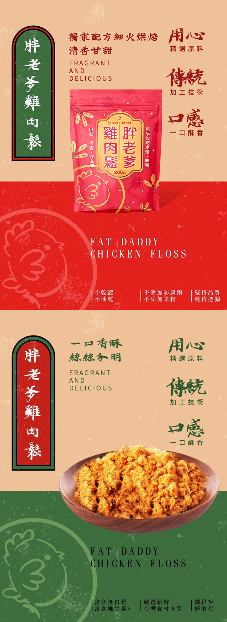 | 產品特色 | 精選健康純雞肉搭配簡單調味 獨家配方細火烘焙 肉質清香甘甜,纖維清晰可辨 絲絲入口,爽口而不膩 適合全家人的新選擇 |