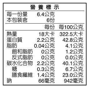 | 內容物(成分) | 海苔,醬油非基因改造,糖,麥芽糖,香菇水,甜味劑 D-山梨醇液70%,海藻糖,味醂(果糖、水、糯米、蓬萊米、米麴、食鹽、胺基乙酸、DL-胺基丙酸),食鹽,香菇精粉(糊精、香菇抽出物),L-麩酸鈉,胺基乙酸,琥珀酸鈉二鈉,琥珀酸,DL-蘋果酸鈉,L-天門冬酸鈉,5'-次黃嘌呤核苷磷酸二鈉,5'鳥嘌呤核苷磷酸二鈉,檸檬酸,甜味劑 甘草萃,大豆卵磷脂,辣椒精。 |