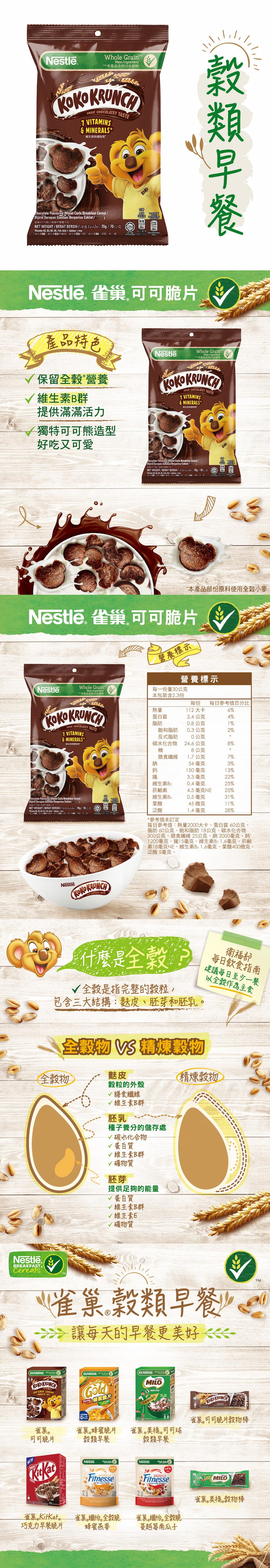 | 產品特色 | 围雀巢可可脆片富含鈣質與膳食纖維,香濃的巧克力口味,深受小朋友喜愛及媽媽信賴。 围特殊的造型,增添在實用上的特性。 |