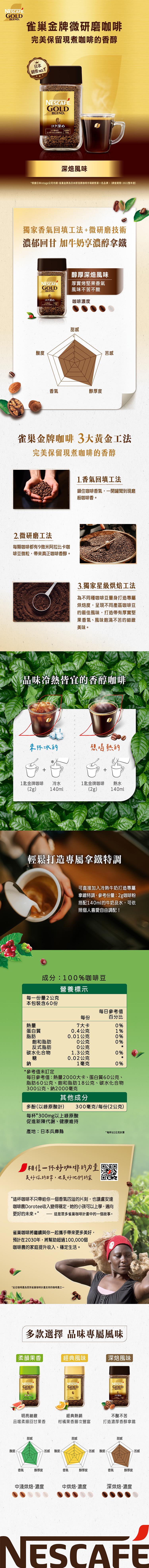 | 產品特色 | ● 深焙風味,不苦不酸搭牛奶更順口。 ● 雀巢金牌為日本即溶黑咖啡市場銷售第一名的品牌。 ● 微研磨技術讓咖啡保有如頂級研磨咖啡般醇香 |