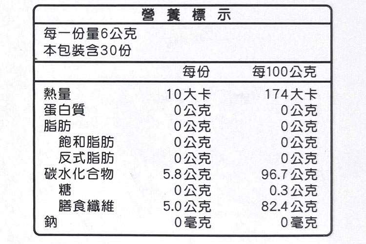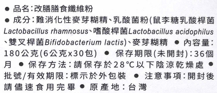 | 內容物(成分) | 難消化性麥芽糊精、乳酸菌粉(鼠李糖乳酸桿菌Lactobacillus rhamnosus、嗜酸桿菌Lactobacillus acidophius、雙叉桿菌Bifidobacterim lactis)、麥芽糊精 |