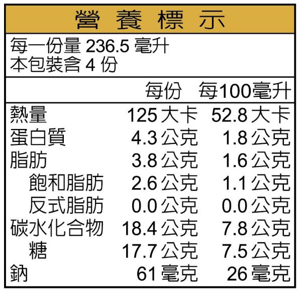 | 產品特色 | 1.使用印度紅茶搭配濃厚牛奶,口感滑順,茶香餘味久久不散。 2.乳製品含量達50%以上,同時補充營養。 3.冬天加熱喝,暖心又暖身。 |