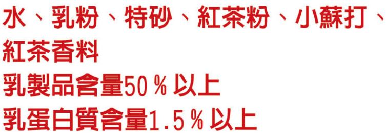 | 內容物(成分) | 水、乳粉、特砂、紅茶粉、小蘇打、紅茶香料 |