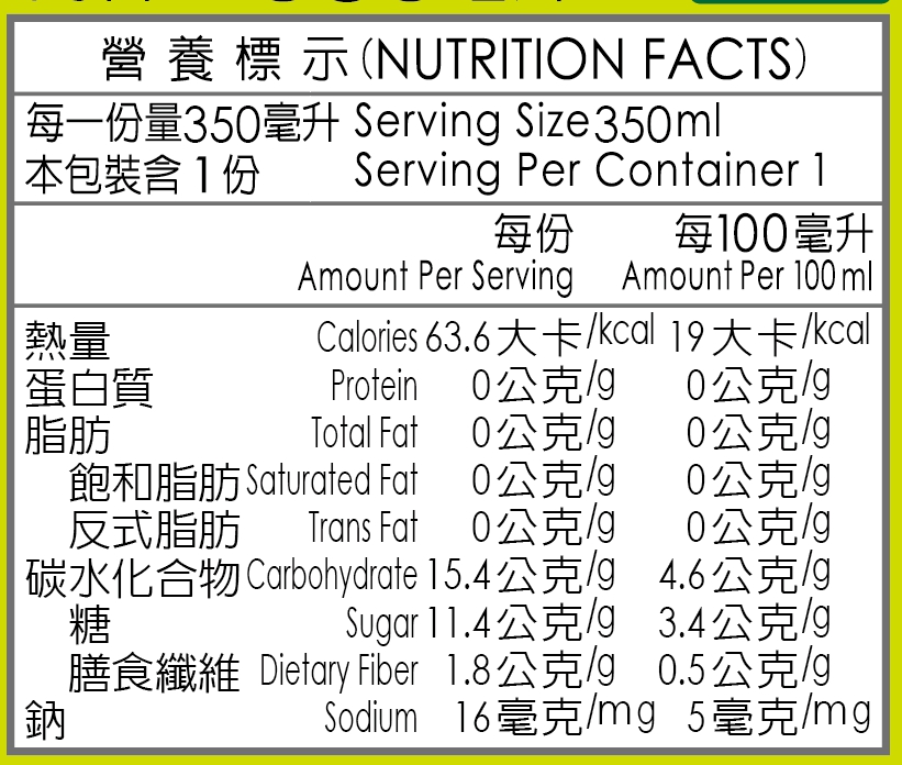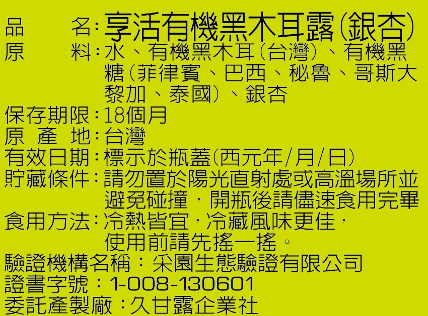 | 內容物(成分) | 水、有機黑木耳(台灣)、有機黑糖(菲律賓、巴西、祕魯、哥斯大黎加、泰國)、銀杏 |