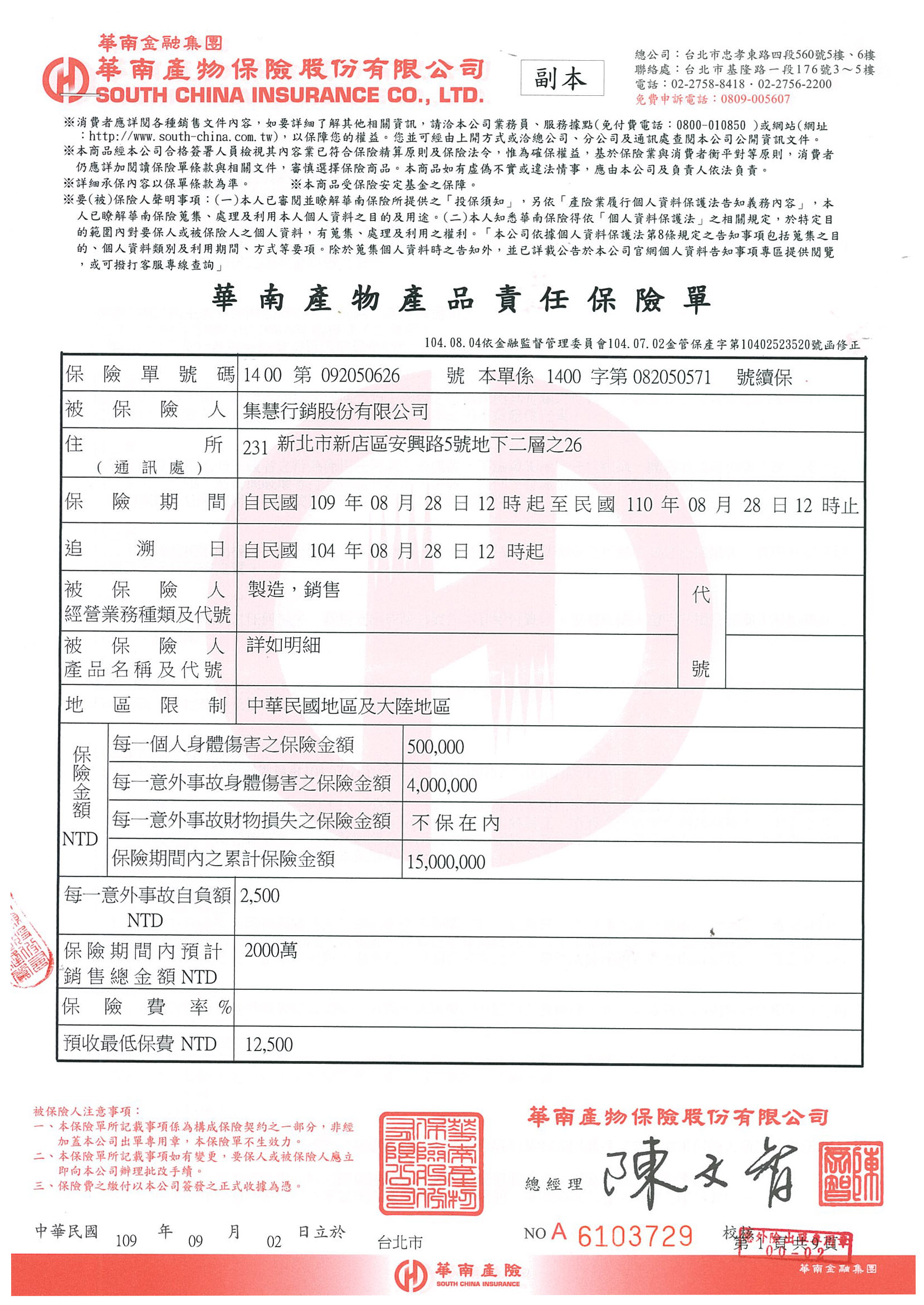 | 產品責任保險字號 | 保險字號1400第092050626