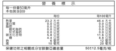 | 產品使用前說明 | 1.請洽詢醫師或營養師有關飲用本品之意見,均衡飲食及適當運動,為身體健康之基礎。 2.如有沉澱,請搖勻後使用。 3.本產品供保健用,請依建議攝取量食用。 |