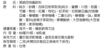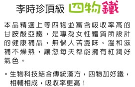 | 產品特色 | 結合女性聖品”四物湯”與專利”活性鐵”,可幫助鐵質吸收、有效補充鐵質。最值得一提的是,它完全沒有濃厚的四物味道,口感像極了酸梅湯,讓人不用捏著鼻子猛灌。 |