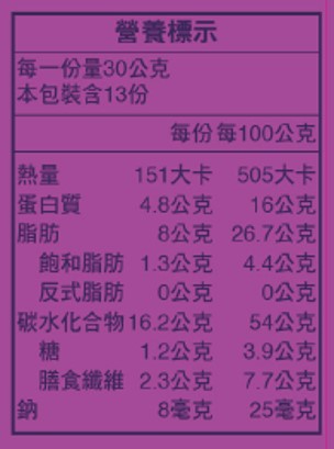 | 內容物(成分) | 十種黑色營養食材(黑芝麻、熟地、黑花生、黑豆、黑藜麥、黑麥、黑米、黑棗、黑醋栗、黑木耳)、燕麥、糙米、麥芽糊精、白芝麻粉、烤焙小麥粉、黃豆粉、膨發小麥粉、乳清粉、碳酸鈣、小麥纖維、大麥粉、玉米粉、薏仁粉、麥芽粉。 |
