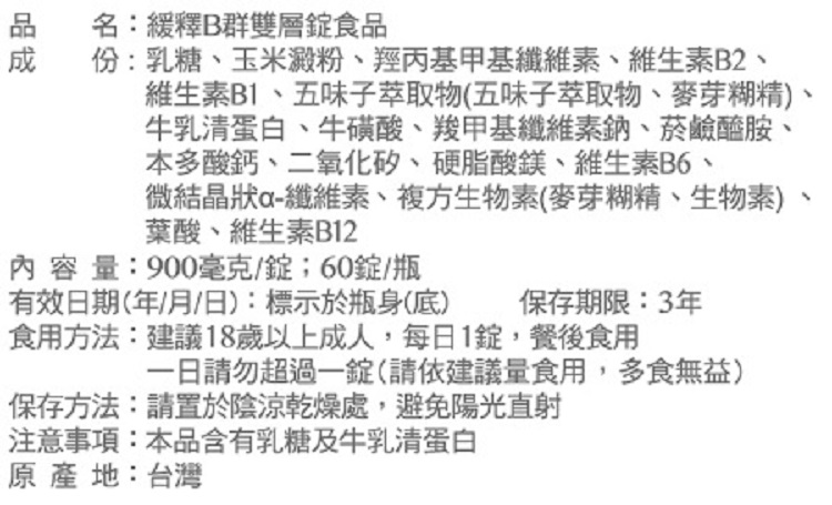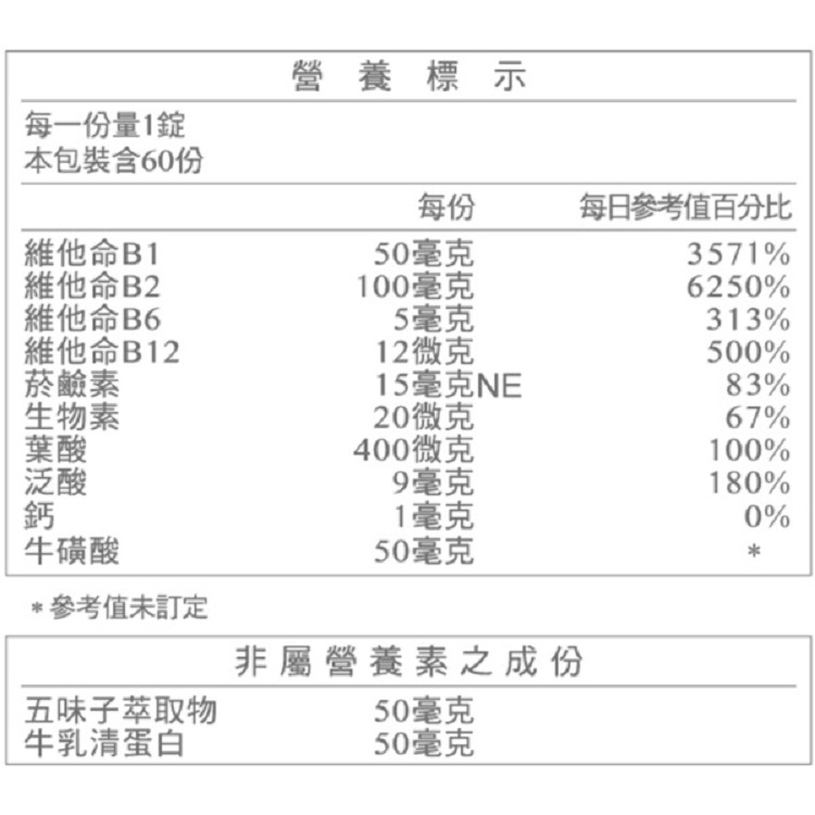 | 內容物(成分) | 主要成分: 維生素B2、維生素B1、五味子萃取物、乳清濃縮蛋白、牛磺酸、菸鹼醯胺、泛酸鈣、維生素B6、生物素、葉酸、維生素B12 其他成分: 乳糖、玉米澱粉、羥丙基甲基纖維素、羧甲基纖維素鈉、二氧化矽、硬脂酸鎂、微晶纖維素、羥丙基纖維素 |