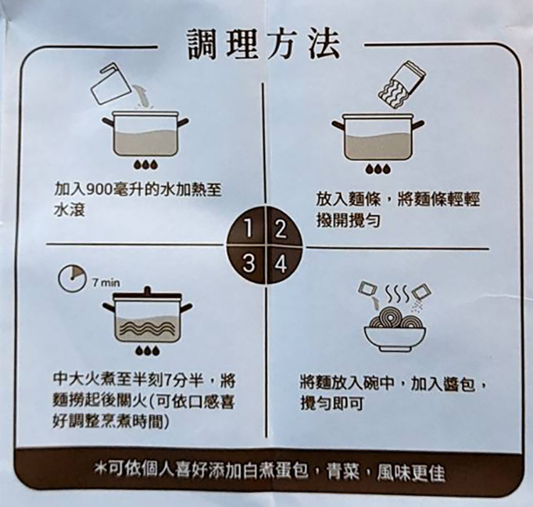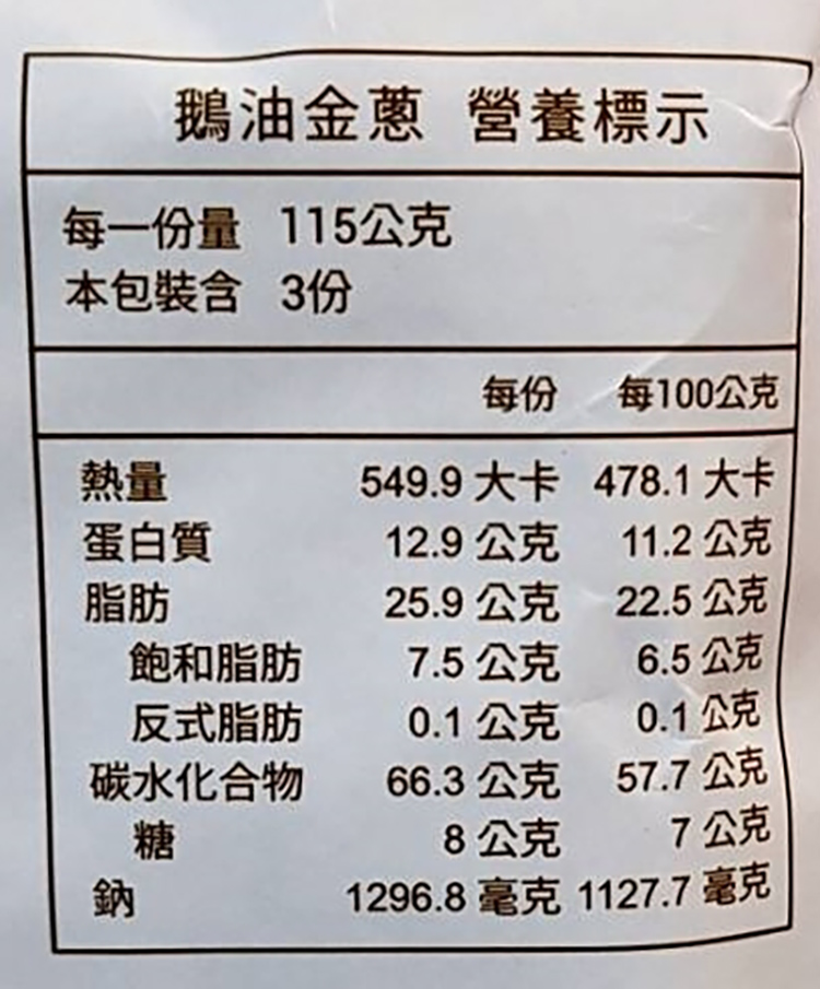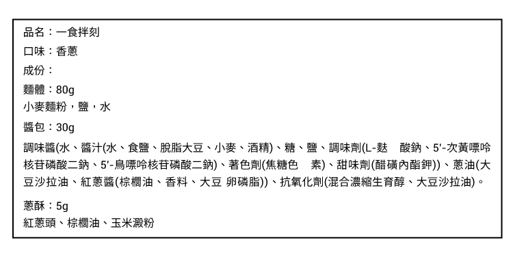 | 內容物(成分) | 麵體:80g 小麥麵粉,鹽,水 醬包:30g 調味醬(水、純釀造醬油、糖、鹽、調味劑(L-麩酸鈉、5’–次黃嘌呤核苷磷酸二鈉、5 ’–鳥嘌呤核苷磷酸二鈉)、著色劑(焦糖色素)、甜味劑(醋磺內酯鉀))、蔥油(大豆沙拉油、鵝油、紅蔥頭香料香料(香料、抗氧化劑(維生素E))、抗氧化劑(混合濃縮生育醇))。 蔥酥:5g 紅蔥頭、棕櫚油、玉米澱粉 |