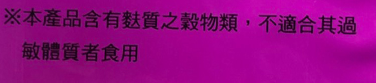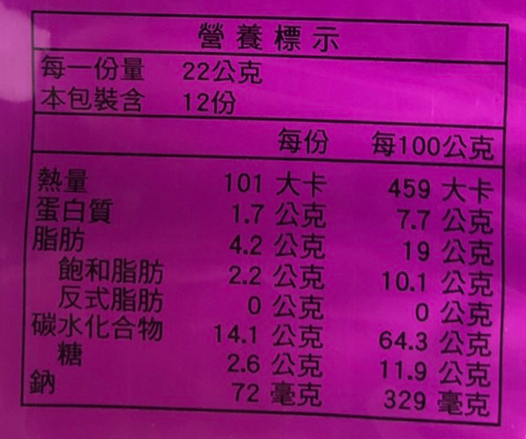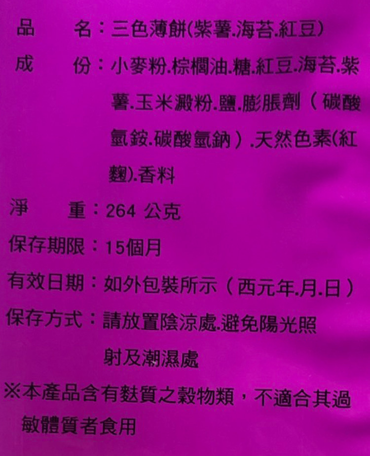 | 內容物(成分) | 小麥粉、棕櫚油、糖、紅豆、海苔、紫薯、玉米澱粉、鹽、膨脹劑(碳酸氫銨、碳酸氫鈉)天然色素(紅麴)香料 |
