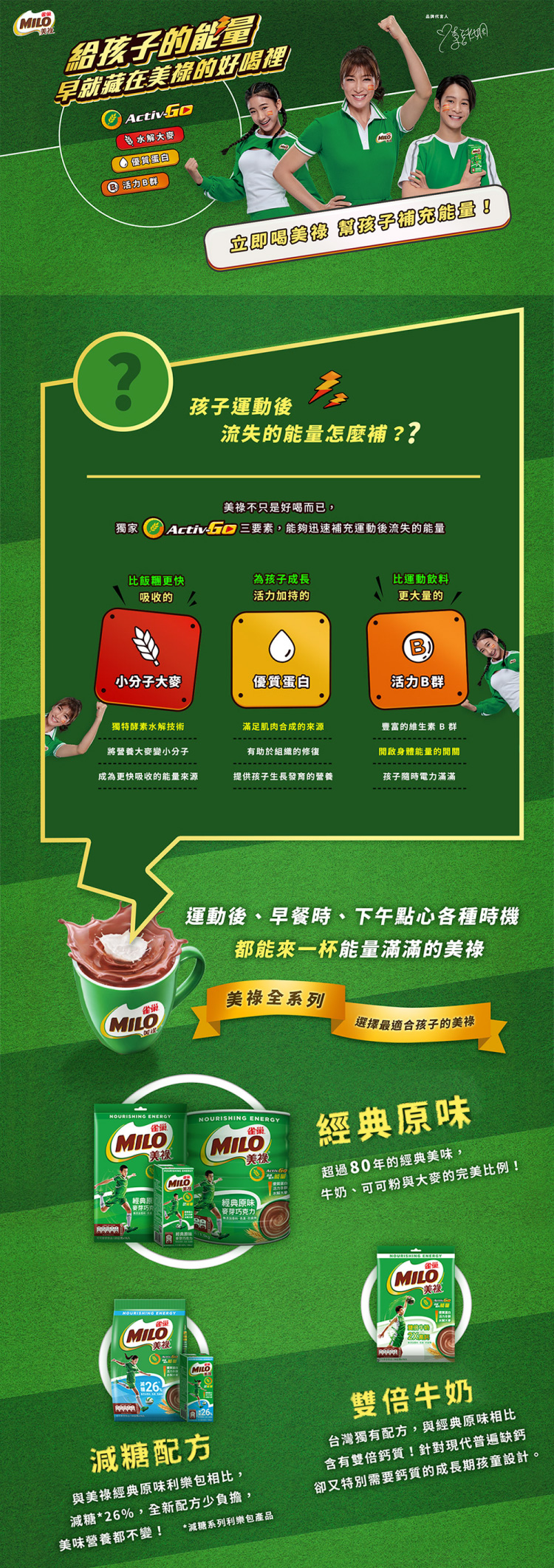 | 產品特色 | "台灣獨有配方,針對現代普遍缺鈣卻又特別需要鈣質的成長期孩童設計,與經典原味相比,除原有的優質可可粉、黃金大麥、多元維生素和礦物質之外,更含有雙倍鈣質。" |