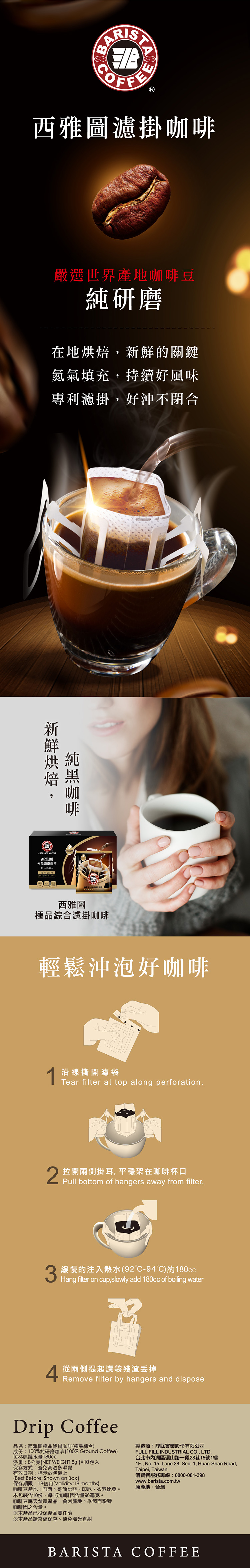 | 產品特色 | 1.綜合咖啡豆配方,口感香純、不酸不苦、圓融滑順 2.咖啡為深焙烘焙,為老饕首選 3.全時段時間都適合飲用 |