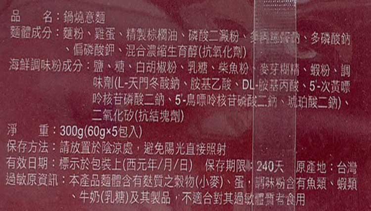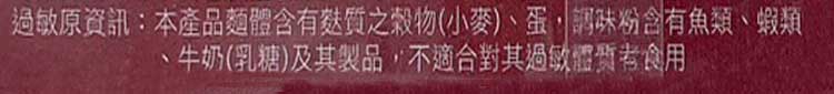 | 過敏源註記 | 本產品麵體含有麩質之穀物(小麥)、蛋,調味粉含有魚類、蝦類、牛奶(乳糖)及其製品,不適合對其過敏體質者食用。 |