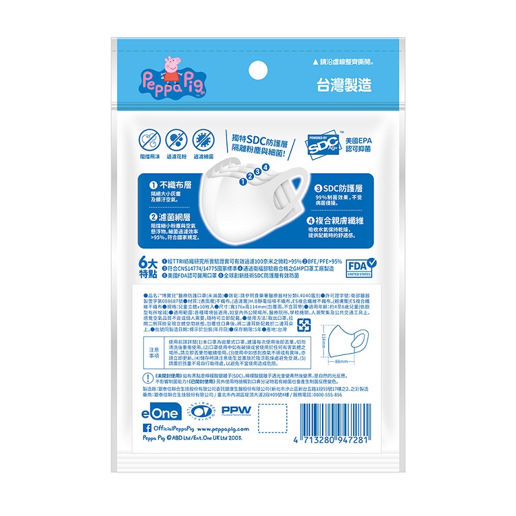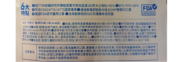 | 商品說明 | 經TTRI紡織研究所實驗證實可有效過濾100奈米之微粒>95% BFE/PFE>95% 符合CNS14774/14775國家標準 通過衛服部驗廠合格之GMP口罩工廠製造 全球創新技術SDC防護層有效防菌 |