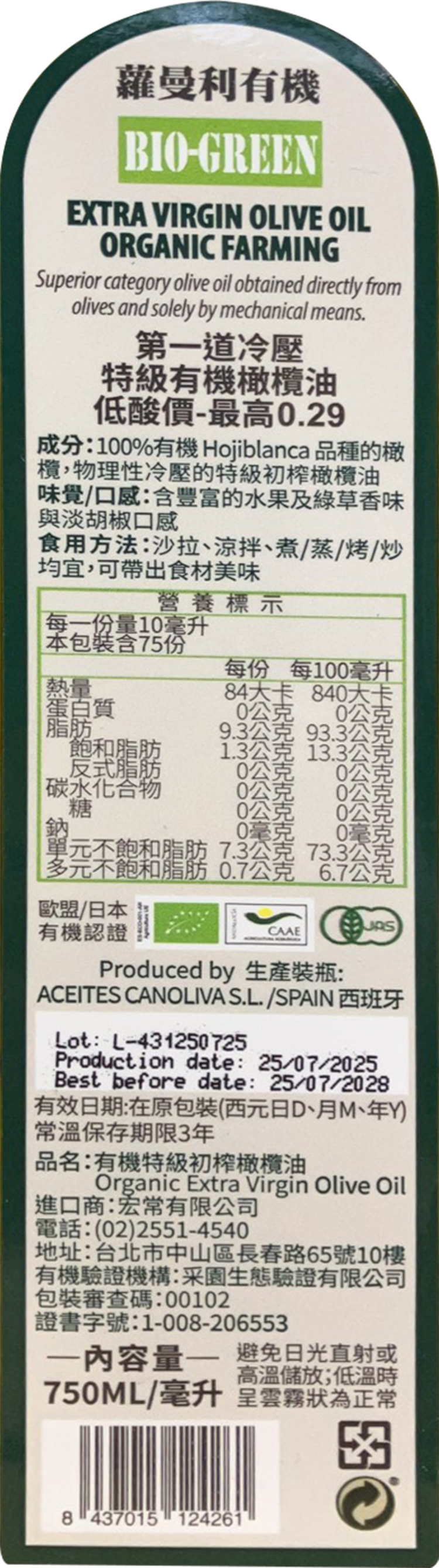蘿曼利有機第一道冷壓特級純橄欖油 750ml