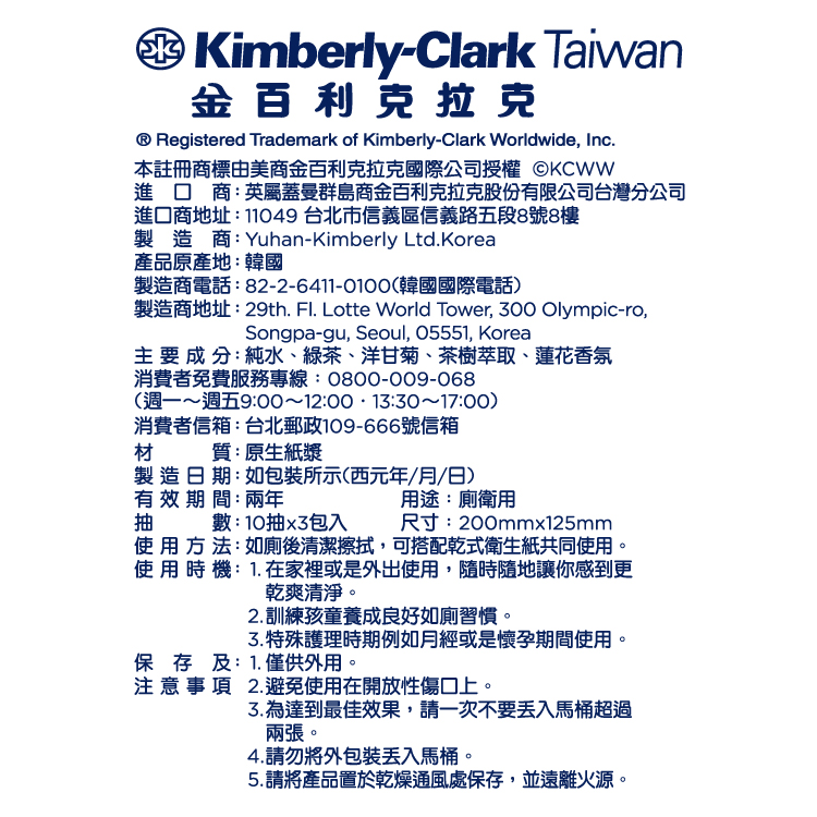 | 國內負責廠商 | 英屬蓋曼群島商金百利克拉克股份有限公司台灣分公司 0800-009-068 台北市信義區信義路五段8號8樓 9:00-18:00 |