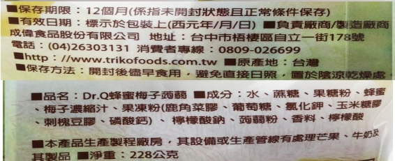 | 製造廠商 | 成偉食品股份有限公司 (04)2630-3131 台中市梧棲區自立一街178號 週一至週五08:00-17:00 |