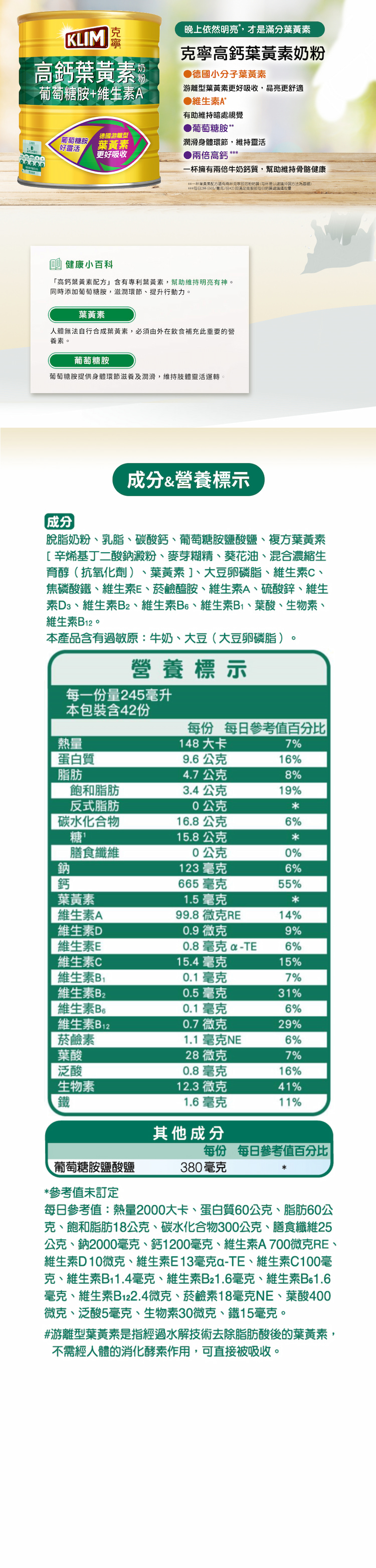 | 營養標示(熱量) | 每一份量 245 公克 本包裝含 42 份 每份 每日參考值百分比 熱量? 148? 大卡? 7%? 蛋白質? 9.6? 公克? 16%? 脂肪? 4.7? 公克? 8%? ??? 飽和脂肪?3.4? 公克? 19%? ??? 反式脂肪?0? 公克? *? 碳水化合物? 16.8? 公克? 6%? ??? 糖1? 15.8? 公克? *? 膳食纖維? 0? 公克? 0%? 鈉? 123? 毫克? 6%? 鈣? 665? 毫克? 55%? 葉黃素? 1.5? 毫克? *? 維生素 A? 99.8? 微克 RE 14%? 維生素 D? 0.9? 微克? 9%? 維生素 E? 0.8? 毫克 α-TE? 6%? 維生素C? 15.4? 毫克? 15%? 維生素 B1? 0.1? 毫克? 7%? 維生素 B2? 0.5? 毫克? 31%? 維生素 B6? 0.1? 毫克? 6%? 維生素 B12?0.7? 微克? 29%? 菸鹼素? 1.1? 毫克NE?6%? 葉酸? 28? 微克? 7%? 泛酸? 0.8? 毫克? 16%? 生物素? 12.3? 微克? 41%? 鐵? 1.6? 毫克? 11%? 其他成分? 每份? 每日參考值百分比? 葡萄糖胺鹽酸鹽? 380? 毫克? *? |
