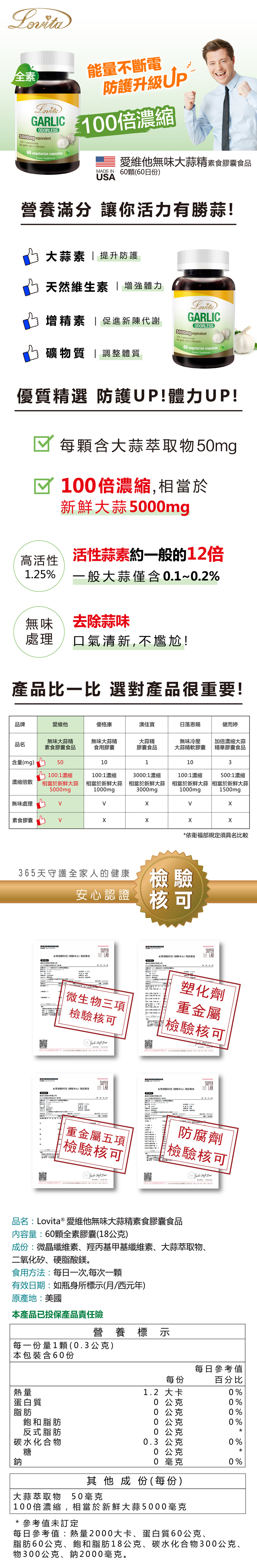 | 商品說明 | 增強防護力 ◎ 100倍超高濃縮,相當於5000mg ◎ 大蒜素(Allicin)標準定量1.25% ◎ 特殊製程無蒜味 |