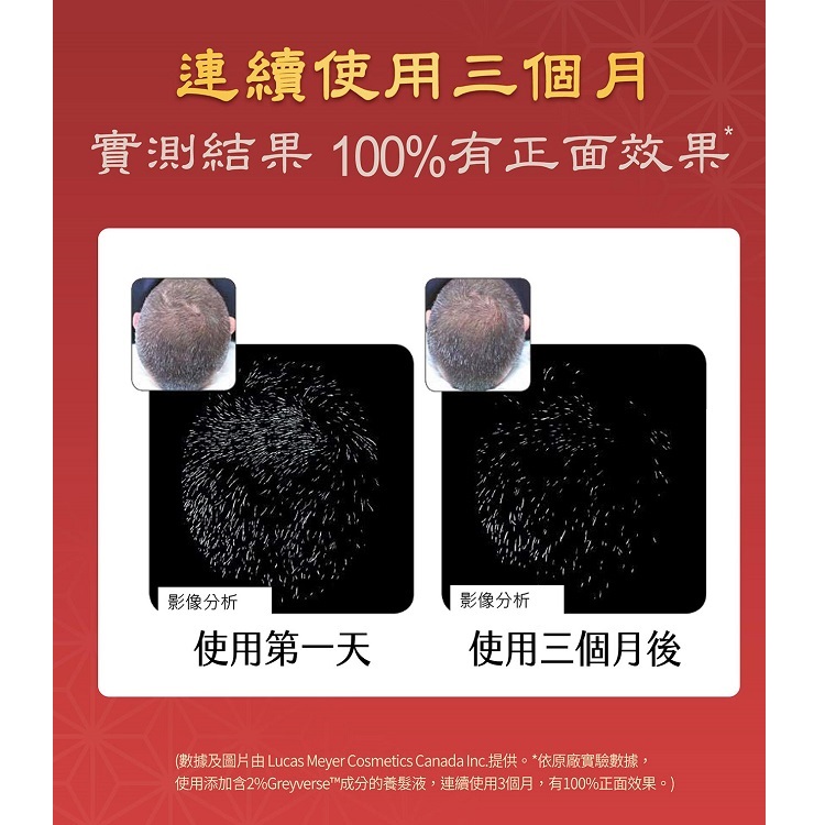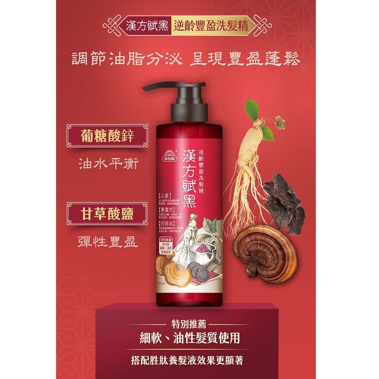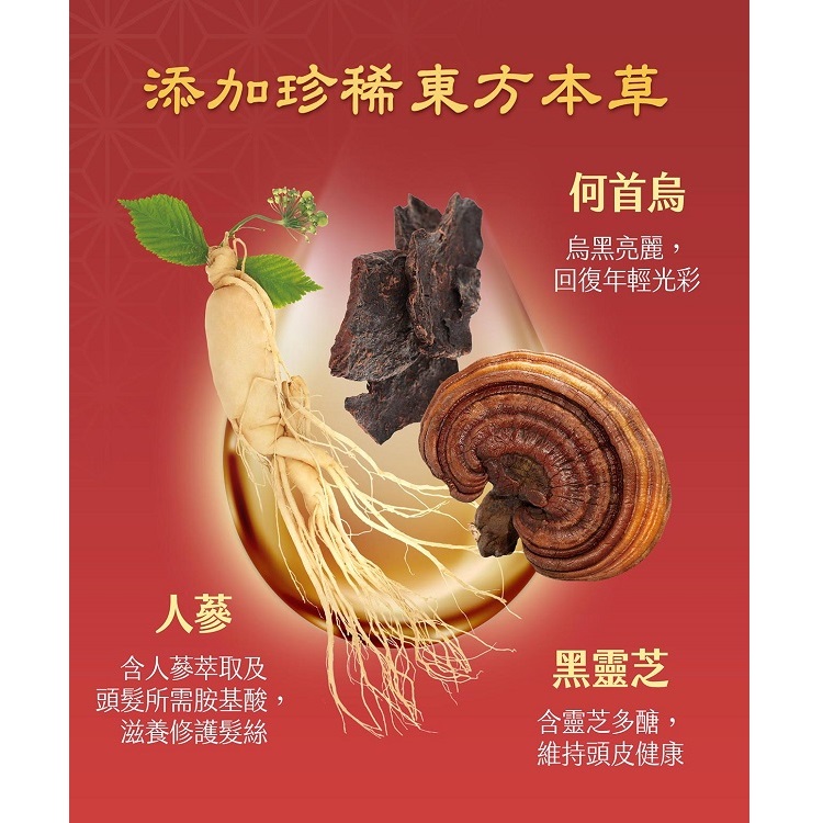 | 產品特色 | 1. 珍選漢方人蔘、黑靈芝及何首烏精萃,滋養修護髮絲,再現亮麗風采 2. 特選專利仿生胜肽協同決明葉精萃,舒緩髮根壓力 3. 添加葡糖酸鋅,調節油脂分泌,使髮根蓬鬆不扁塌 |