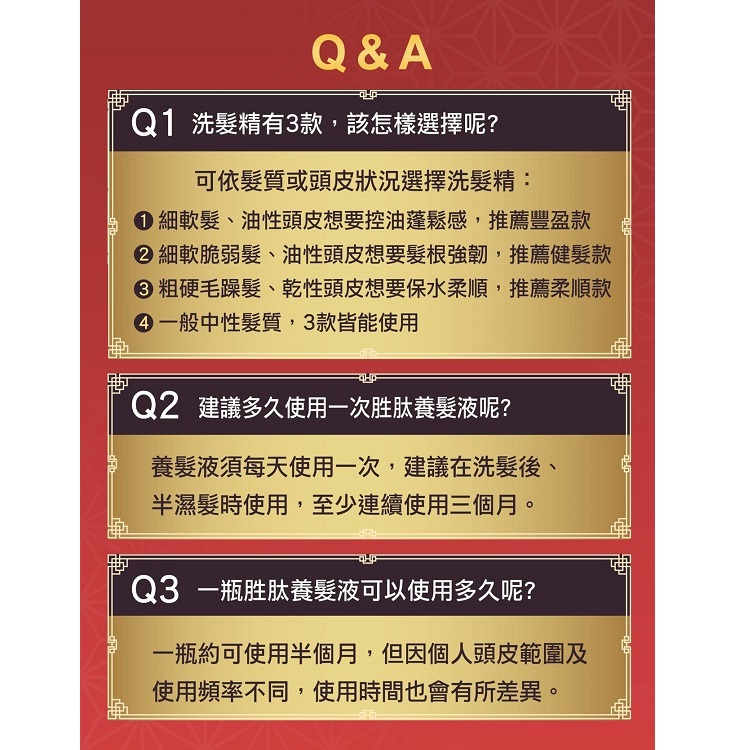 | 商品說明 | 1. 珍選漢方人蔘、黑靈芝及何首烏精萃,滋養修護髮絲,再現亮麗風采 2. 特選專利仿生胜肽協同決明葉精萃,舒緩髮根壓力 3. 添加葡糖酸鋅,調節油脂分泌,使髮根蓬鬆不扁塌 |