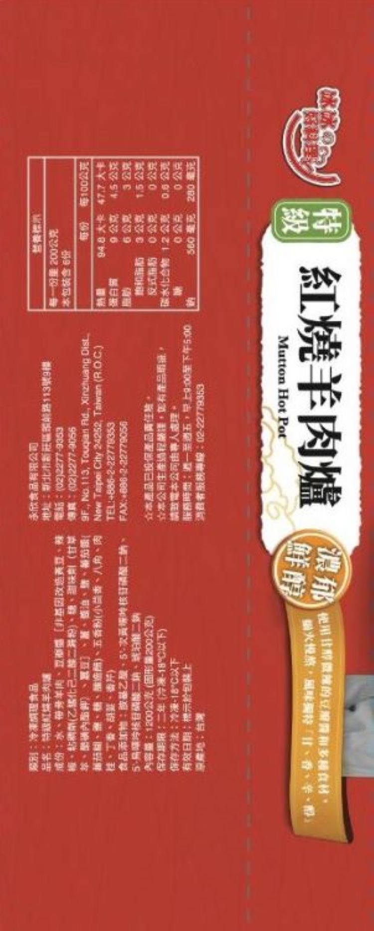 | 內容物(成分) | 水.帶骨羊肉.豆瓣醬(非基因改造黃豆.辣椒.黏稠劑(乙醯化己二酸二澱粉).糖.甜化劑(甘草萃.醋磺內酯鉀).蠶豆).薑.醬油.鹽.番茄醬.(番茄糊.鹽.糖.釀造醋).五香粉(小茴香.八角.肉桂.丁香.胡荽.香芹) |