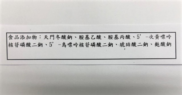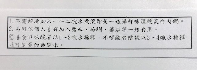 | 內容物(成分) | 水、酸白菜、豬肉、凍豆腐(基因改造)、豆皮(基因改造)、香菇、糯米醋、鹽、大骨粉(大骨濃縮液、糖)、白胡椒粉 |