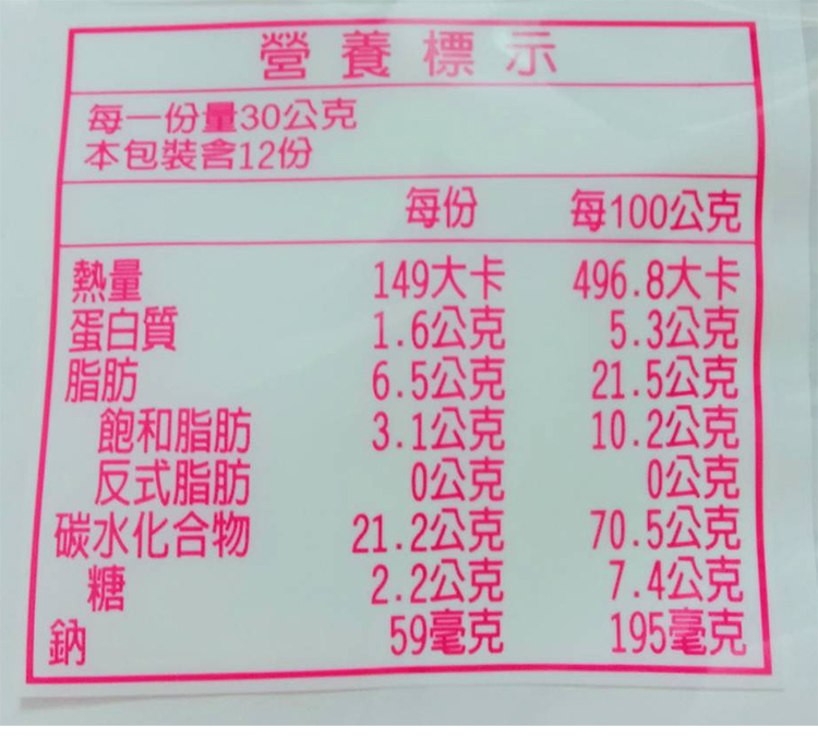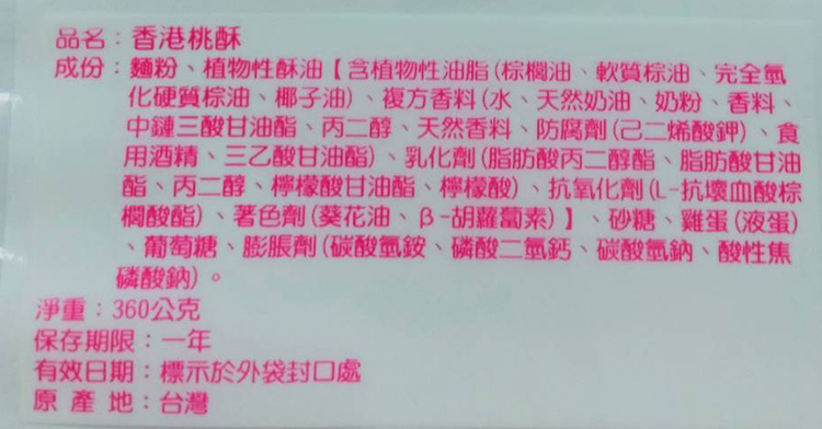 | 內容物(成分) | 麵粉、植物性酥油【含植物性油脂(棕櫚油、軟質棕油、完全氫化硬質棕油、椰子油)、複方香料(水、天然奶油、奶粉、香料、 中鏈三酸甘油酯、丙二醇、天然香料、防腐劑(已二烯酸鉀)、食用酒精、三乙酸甘油脂)、乳化劑(脂肪酸丙二醇酯、脂肪酸甘油酯 、丙二醇、檸檬酸甘油酯、檸檬酸)、抗氧化劑(L-抗化血酸棕櫚酸酯)、著色劑(葵花油、β-胡蘿蔔素)】、砂糖、雞蛋(液蛋) 、葡萄糖、膨脹劑(碳酸氫銨、磷酸二氫鈣、碳酸氫鈉、酸性焦磷酸鈉)。 |