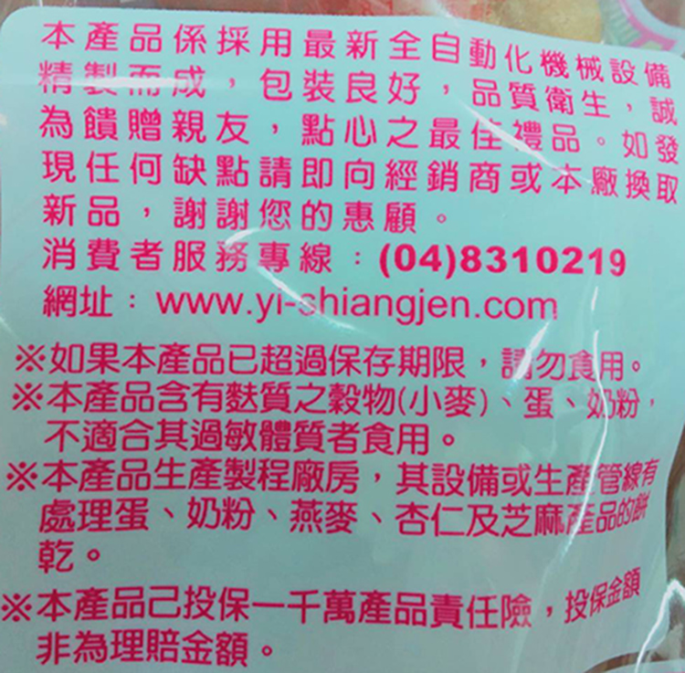 | 製造廠商 | 義香珍行 04-8310219 彰化縣員林鎮三和里三條街295巷7號 一~五早上8:~17:00 |