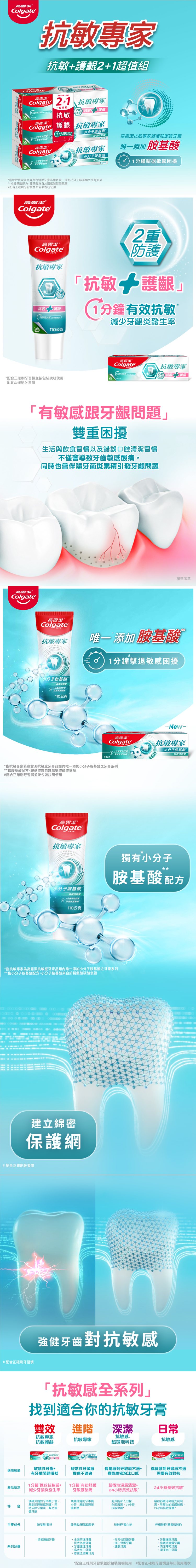| 產品特色 | 围 高露潔抗敏專家修復琺瑯質牙膏獨特Pro-ArginTM胺基酸配方,幫助阻隔敏感刺激 围 幫助封填外露的牙本質小管,達到立即*並持久舒緩的功效 围 經常使用可形成保護膜,幫助持久舒緩敏感酸痛 |