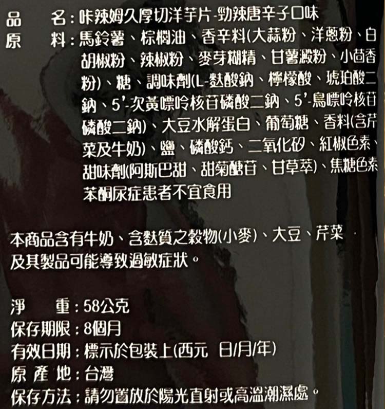 | 內容物(成分) | 原料:馬鈴薯、棕欄油、香辛料(大蒜粉、洋葱粉、白 胡椒粉、辣椒粉、麥芽糊精、甘薯澱粉、小茴香 粉)、糖、調味劑(L-麩酸鈉、檸檬酸、琥珀酸二 鈉、5-次黃嘌呤核苷磷酸二鈉、5'-鳥漂呤核苷 磷酸二鈉)、大豆水解蛋白、葡萄糖、香料(含芹菜及牛奶)、鹽、磷酸鈣、二氧化矽、紅椒色素、 甜味劑(阿斯巴甜、甜菊醣苷、甘草萃)焦糖色素 苯酮尿症患者不宜食用 |
