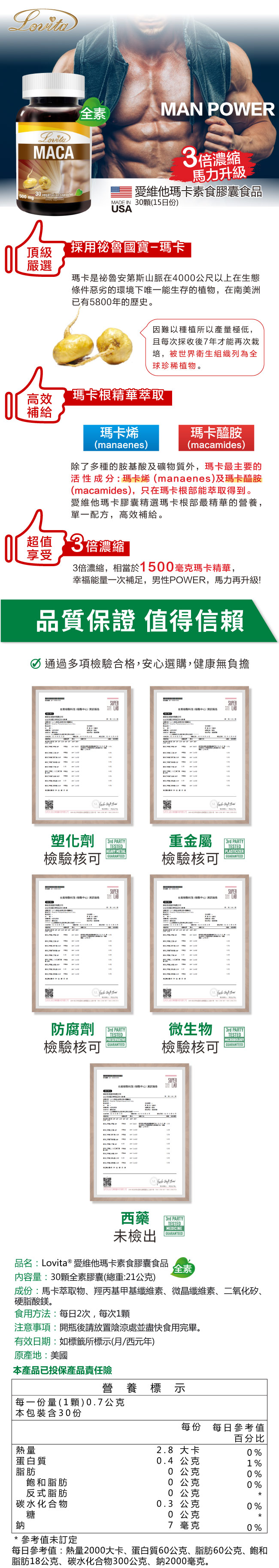 | 內容物(成分) | 馬卡萃取物、羥丙基甲基纖維素、微晶纖維素、二氧化矽、硬脂酸鎂 |