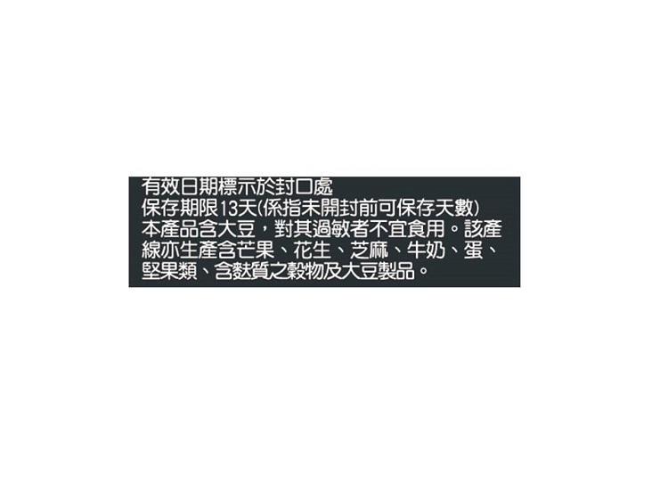 | 過敏源註記 | 本產品含大豆,對其過敏者不宜食用該產線亦生產含芒果、花生、芝麻、牛奶、蛋、堅果類、含麩質之穀物及大豆製品 |