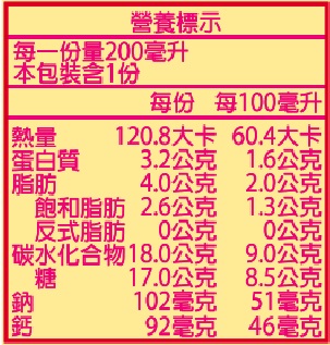 | 內容物(成分) | 水,奶粉,蔗糖,生乳,綜合果汁,(蘋果濃縮汁,白葡萄濃縮汁,鳳梨濃縮汁,柳橙濃縮汁),香料(含葵花油,維生素E,海藻酸鈉,脂肪酸甘油脂,食用黃色四號 |