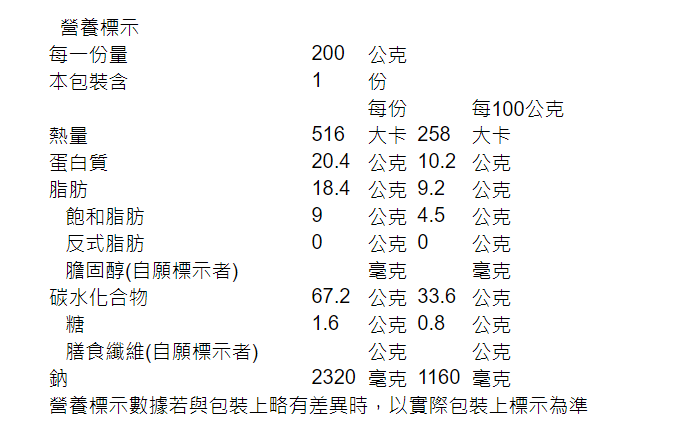 | 過敏源註記 | 過敏原資訊:本產品含有含麩質之穀物、大豆、芝麻及其製品;該生產線亦生產含甲殼類、花生、牛奶、蛋、堅果類、魚類、螺貝類及其製品。 |