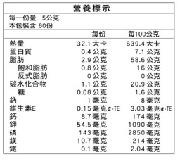| 攝取量 | 每次2~3匙,每匙約五公克。每日1~2次 |