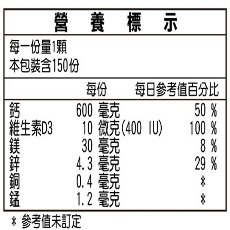 | 內容物(成分) | 主成分:碳酸鈣、維生素D3、氧化鎂、葡萄糖酸鋅、葡萄糖酸錳、 葡萄糖酸銅、酪蛋白磷酸肽 副成分:維晶性纖維素、二氧化矽、交聯羧甲基纖維素鈉、硬脂酸鎂、二氧化鈦 |