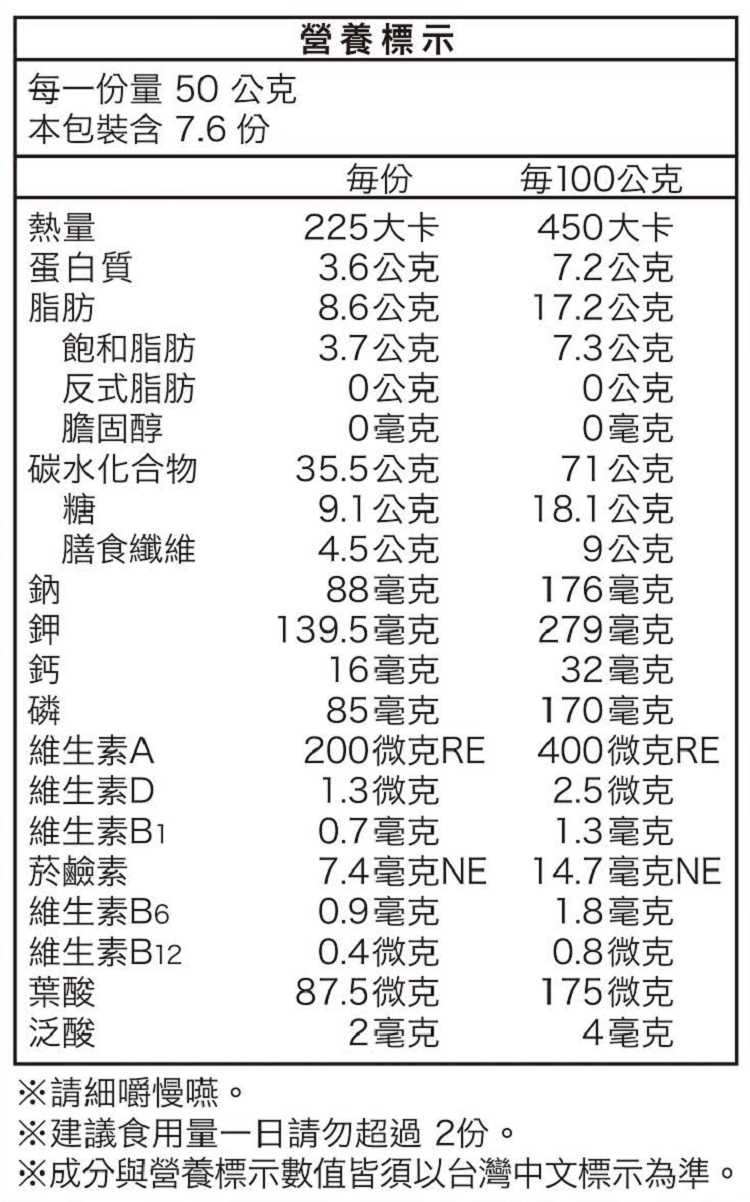 | 內容物(成分) | 燕麥.黑麥粉.糖.乾燥水果(木瓜.葡萄乾、蘋果、草莓)、小麥粉、椰子、麥芽糊精、植物油(棕櫚油)、米粉丶水溶性食物纖維(玉米丶甘薯丶馬鈴食 )、玉米粉丶南瓜籽丶杏仁丶食鹽丶小麥麩丶玄米粉丶甘油、乳化劑(脂肪酸甘油酯)、粘稠劑(醋酸澱粉)丶調昧劑(檸檬酸丶DL-蘋果酸)、抗氧化劑(維生素E)、菸鹼酸、本多酸鈣鈣、粘稠劑(乾酪素鈉)、維生維B6、維生素B1、維生素A脂肪酸酯油溶液、葉酸、膽鈣化醇(維生素D3)丶維生素B12 |