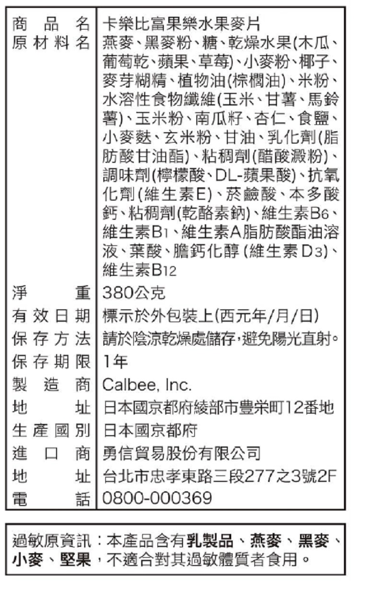 | 製造廠商 | CALBEE.INC. 0800-000369 新北市五股區五權路46號 9:00-17:00 |