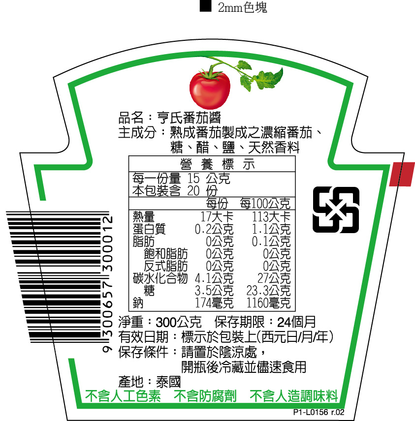 | 內容物(成分) | 陽光下自然熟成番茄製成之濃縮番茄、蒸餾醋、高果糖玉米糖漿、玉米糖漿、鹽、香料、洋蔥粉、天然香料 |