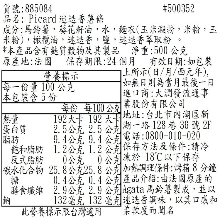 | 內容物(成分) | 馬鈴薯,葵花籽油,水,麵衣(玉米澱粉,米粉,玉米粉),橄欖油,迷迭香,鹽,迷迭香萃取粉 。 |