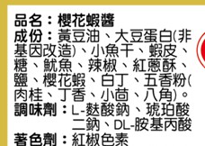 | 內容物(成分) | 櫻花蝦、黃豆油、大豆蛋白(非基因改造)、小魚乾、蝦皮、魷魚、珠貝、紅蔥酥、辣椒、鹽、糖、白丁、琥珀酸二鈉、L-䴲酸鈉、蝦米、DL-蘋果酸鈉、蒜粉、DL-胺基丙酸、五香粉(肉桂、丁香、小茴、八角)、甜味劑(D-山梨醇液70%)。 |