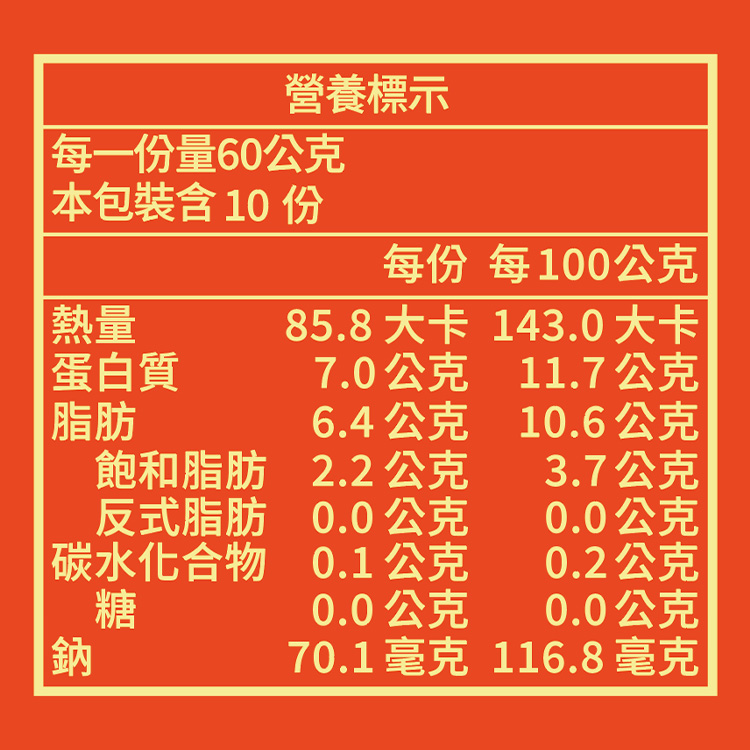 | 營養標示(熱量) | 每一份量60公克 本包裝含10份 每份 每100公克 熱量 85.8大卡 143.0大卡 蛋白質 7.0公克 11.7公克 脂肪 6.4公克 10.6公克 飽和脂肪 2.2公克 3.7公克 反式脂肪 0.0公克 0.0公克 碳水化合物 0.1公克 0.2公克 糖 0.0公克 0.0公克 鈉 70.1毫克 116.8毫克 |