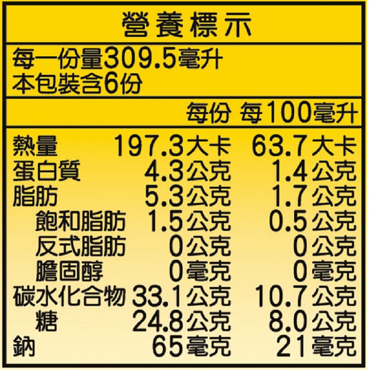 | 內容物(成分) | 水、蔗糖、烤花生、珍珠麥、米粉、糙米粉、薏仁、玉米糖膠、黑芝麻粉、脂肪酸甘油脂、維生素E(抗氧化劑) |