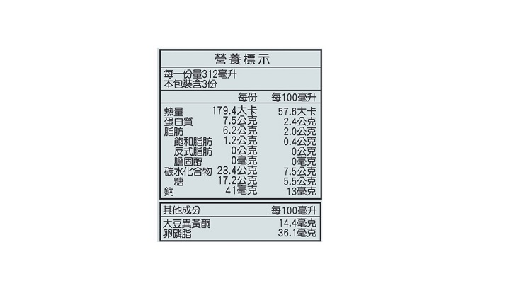 | 內容物(成分) | 水、非基因改造黃豆、蔗糖、芝麻醬(含脂肪酸蔗糖酯)、黑芝麻粉、脂肪酸甘油酯、鹿角菜膠(含葡萄糖) |