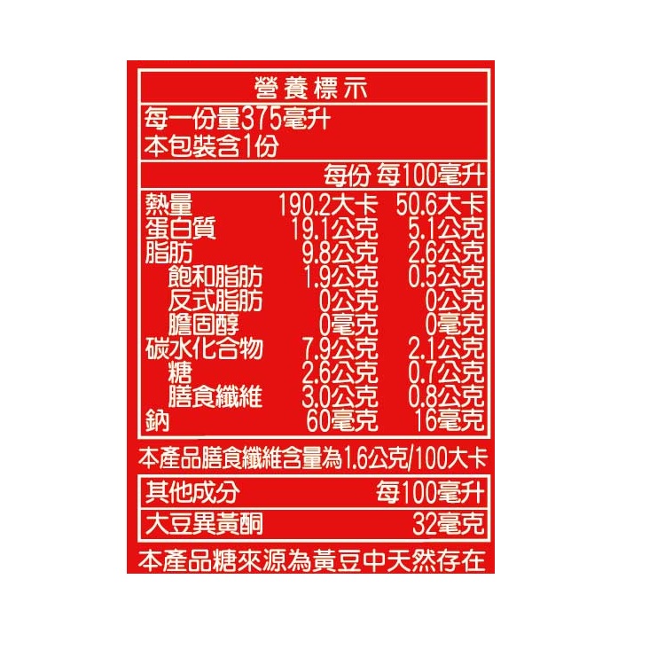 | 產品特色 | 成分單純,除了口感濃郁外,亦給予消費者源自於原料本身的優質蛋白、豆纖維,飲用後可補充營養、無負擔 |