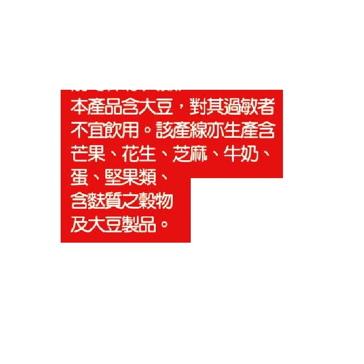 | 過敏源註記 | 本產品含大豆,對其過敏者不宜食用該產線亦生產含芒果、花生、芝麻、牛奶、蛋、堅果類、含麩質之穀物及大豆製品 |